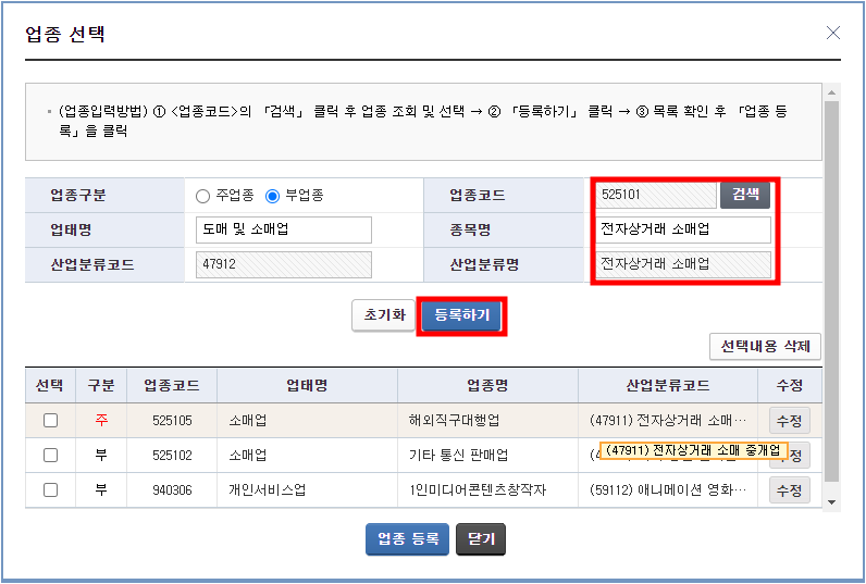 전자상거래 업종코드는 [ 525101] 로 조회한 다음 선택을 눌러서 적용시켜 주세요